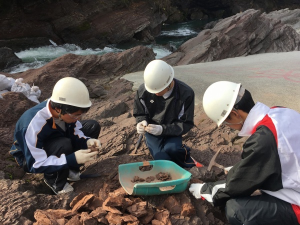 丹波竜の発見現場で、12月20日~21日にかけて、人と自然の博物館研究者が見守る中、地元住民による試掘調査が行われ、21日には地元の高校生も発掘作業に参加しました。