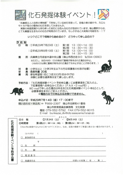 今年3月にオープンいたしました「太古の生きもの館」で化石発掘体験イベントが開催されます。 兵庫県立人と自然の博物館で所有されている岩石を割って、恐竜の骨の破片やカエル・トカゲ等の小動物の化石を探してみませんか? 主 催:篠山市教育委員会 場 所:兵庫並木道中央公園内「太古の生きもの館」 (兵庫県篠山市西古佐90) 実施日:①平成29年7月29日(土)第1部13:00~14:00                   第2部14:30~15:30      ②平成29年8月19日(土)第1部13:00~14:00               第2部14:30~15:30 対 象:小学生以上(小学3年生以下の方は保護者の付添が必要) 定 員:各部先着20名 参加費:300円(おみやげ付)     ※参加には事前予約が必要です。(申込書に必要事項記載して申し込んでください。) 内 容:石割体験(体験に必要な道具等は全て貸し出します。) 申込み:平成29年7月14日(金)17:00まで 問合せ:篠山市教育委員会 文化財課     電話:079-552-5792     メール:bunkazai_div@city.sasayama.hyogo.jp HP:篠山市HP→文化財課→新着情報       「化石発掘体験参加者募集について」をご覧ください。 SKM_C454e17072116530