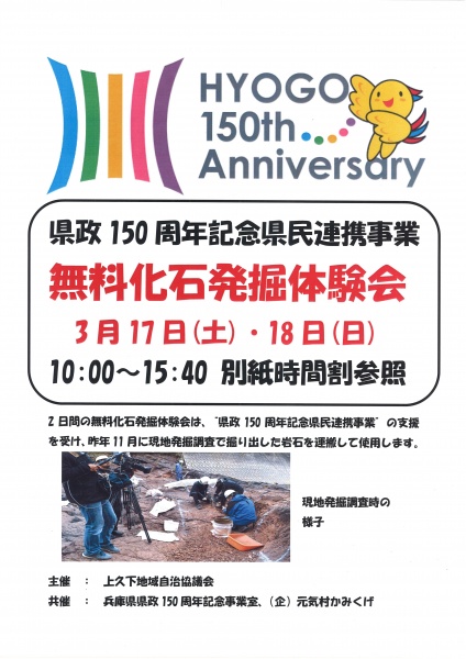 県政150周年記念県民連携事業として、篠山層群から掘り出した岩石を使用した「無料化石発掘体験会」が、上久下地域自治協議会主催で実施されます。化石発掘体験は初めてという人必見です。是非ご参加ください。!!